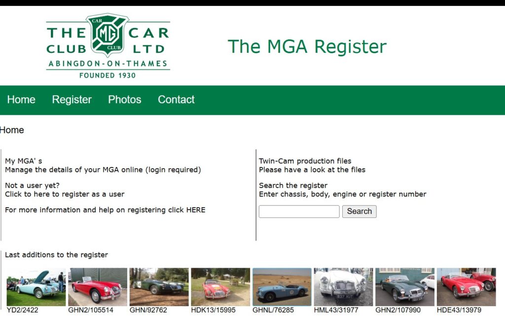 The Register contains records on more than 6500 MGA’s worldwide and is the central source of information about the specification and ownership of all surviving MGA models, including the De Luxe and Twin-Cam models. To access the Register click HERE.